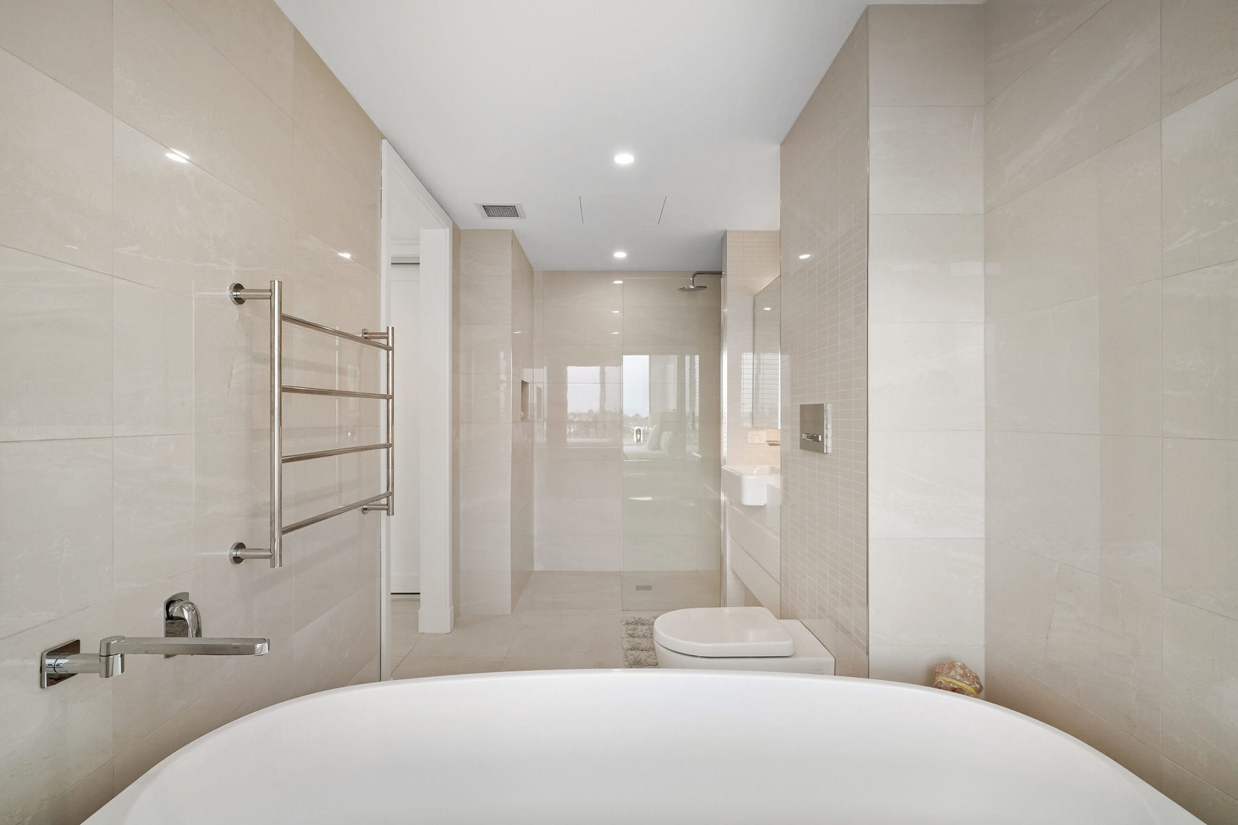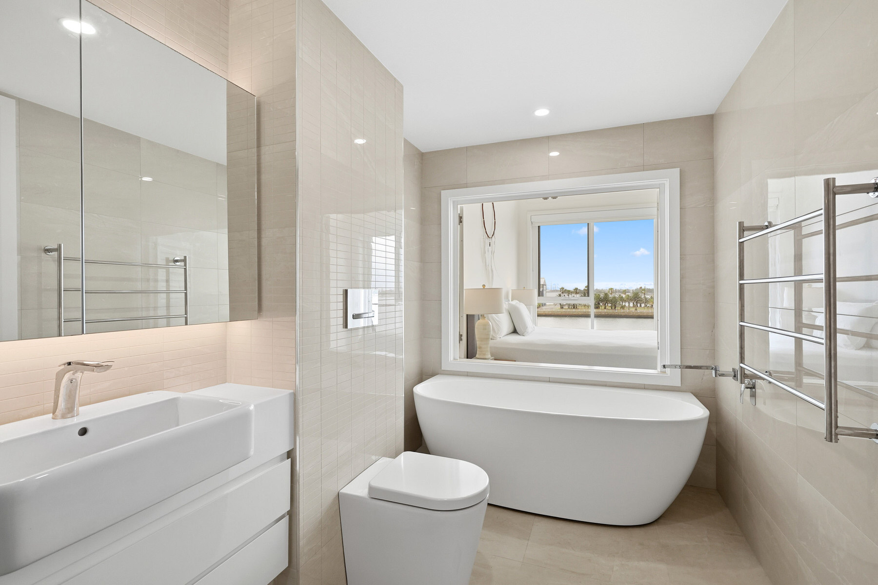– Walk-through wardrobe and ensuite to the main bedroom, with a shuttered bath opening to the bedroom and harbour views