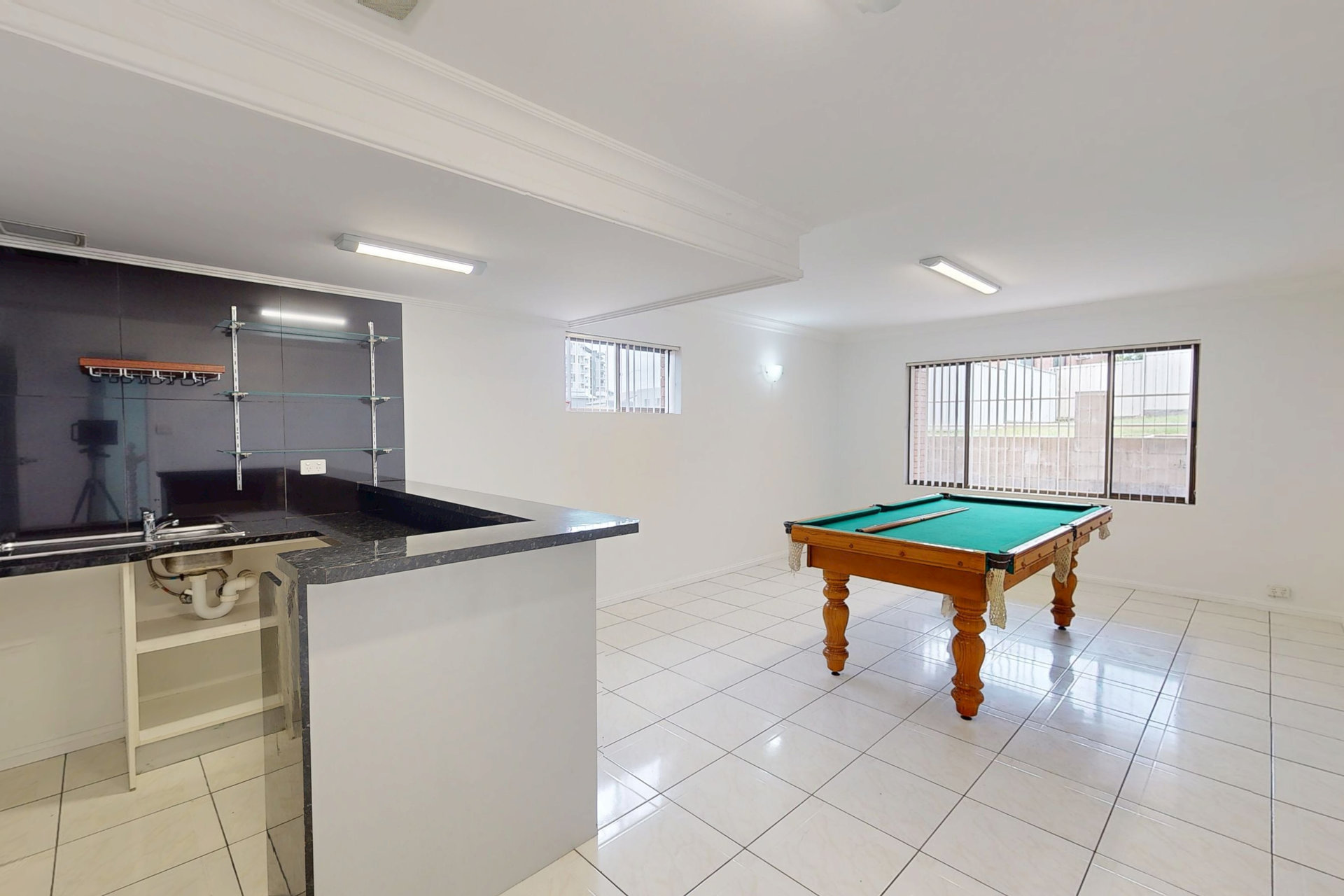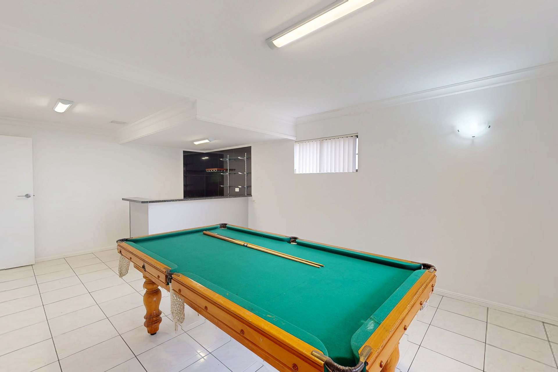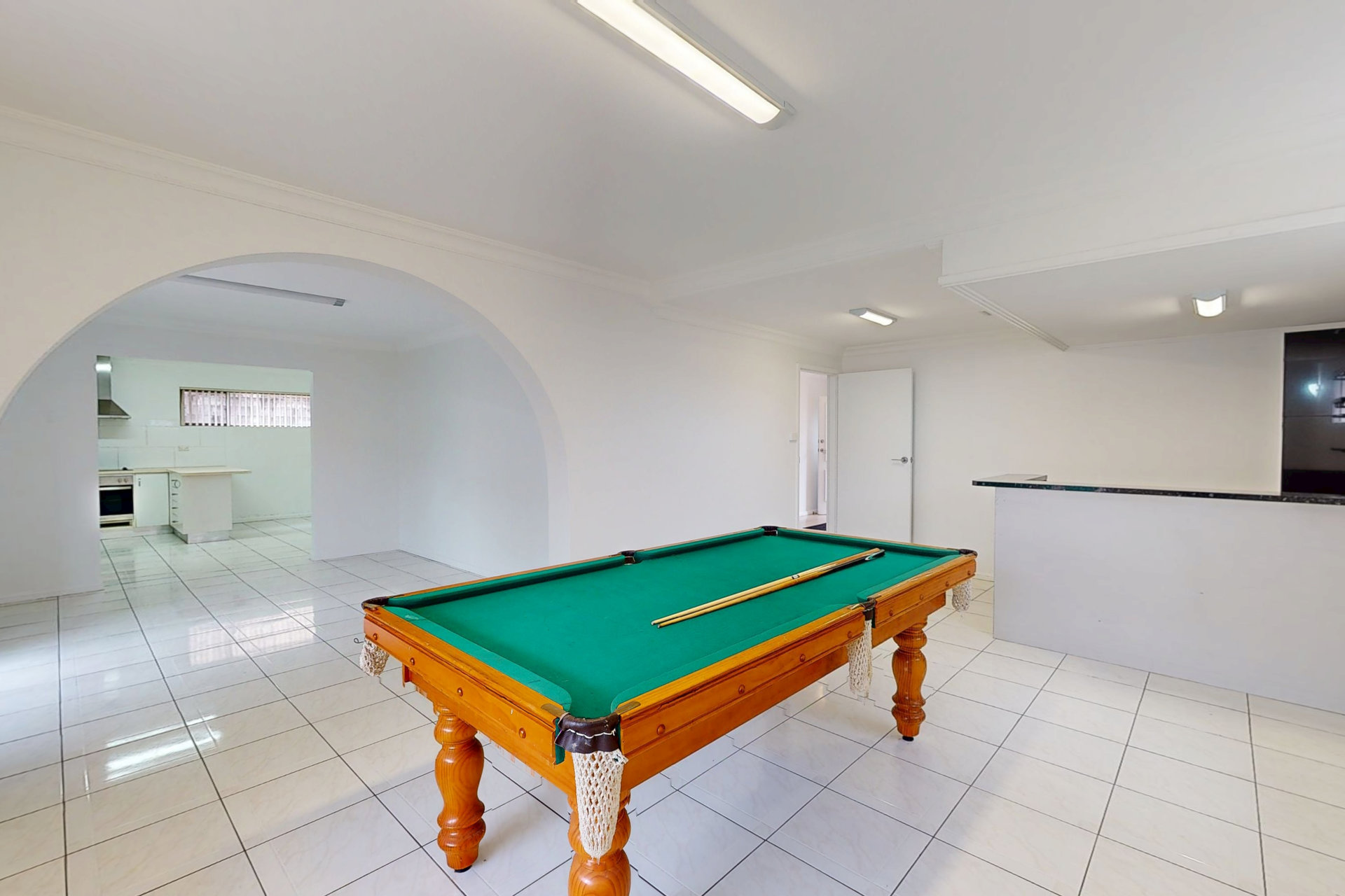 – Self-contained downstairs area featuring a large living space, kitchen, bathroom, bar, and pool table