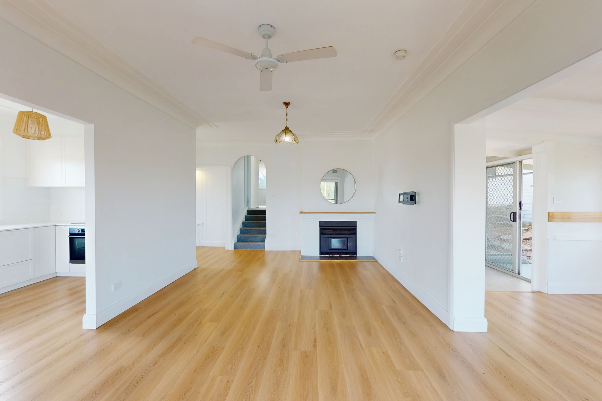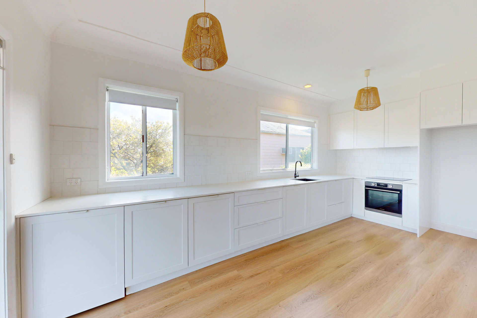 Enjoy seamless living with an open-plan kitchen and dining showcasing picturesque lake views. The modern kitchen boasts sleek cabinetry, an electric induction cooktop, under-bench oven, and a cleverly integrated European-style laundry.
