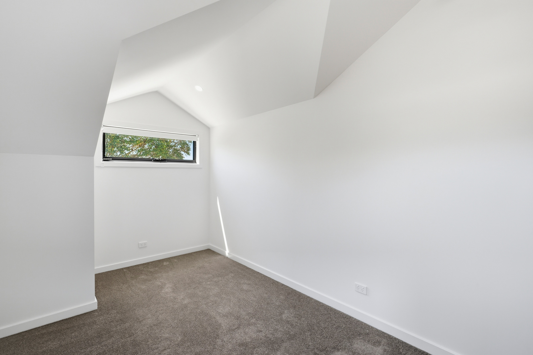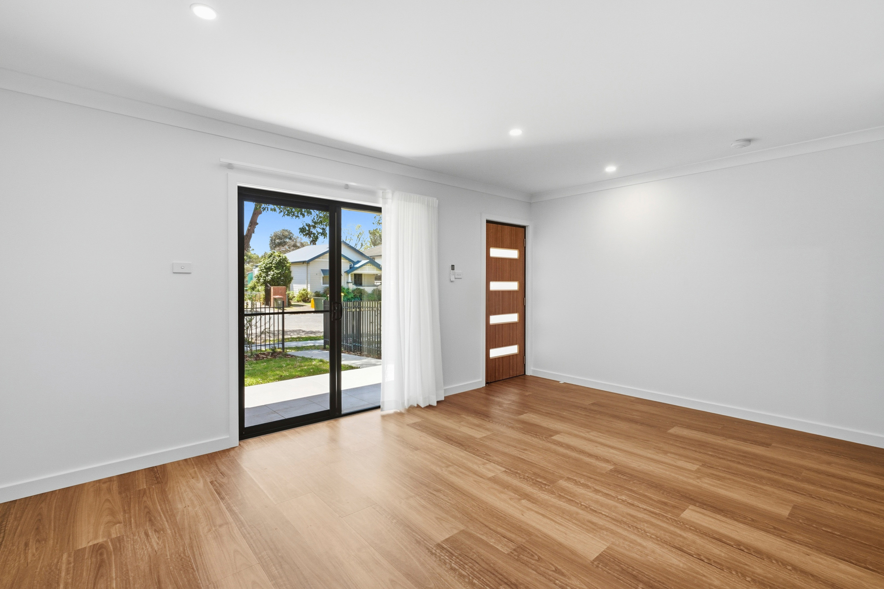– Open-plan living area with a sliding door onto a small grassed garden at the front of the property