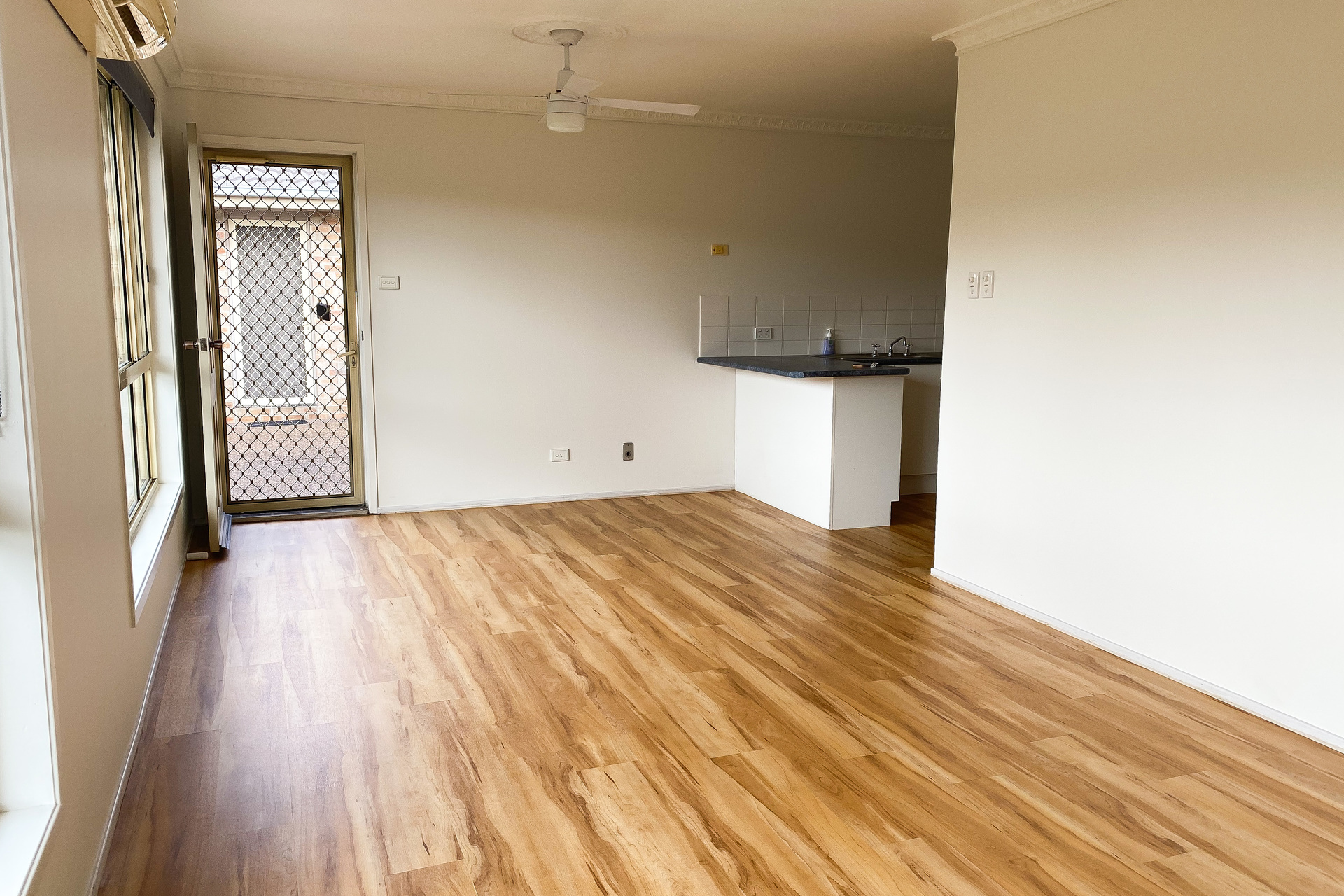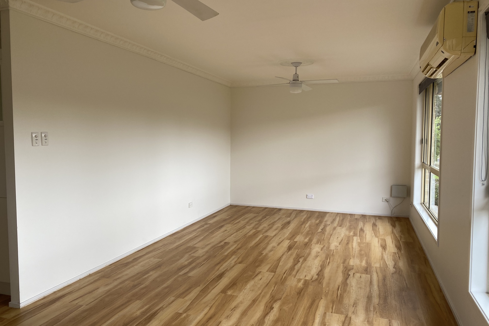– Split system air conditioner and ceiling fan to the open plan living area