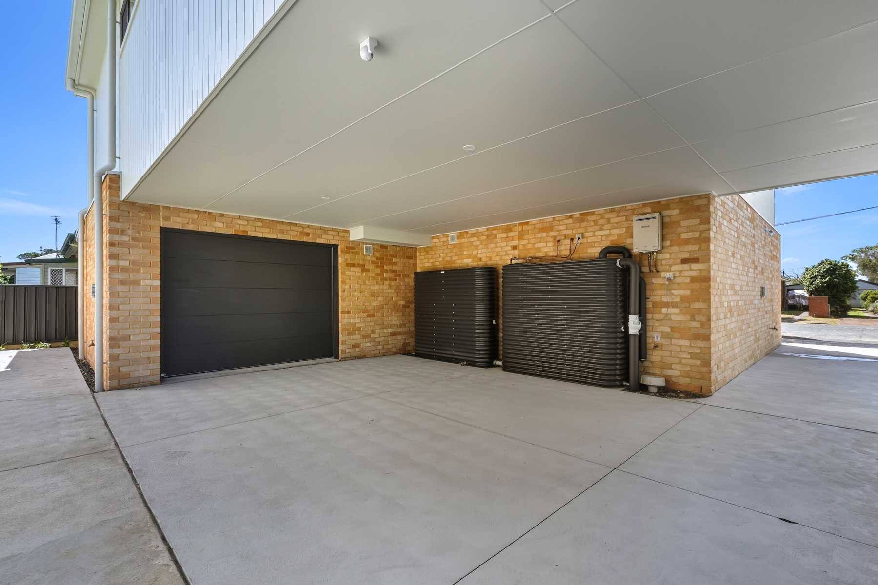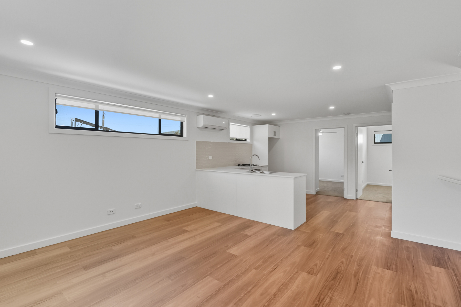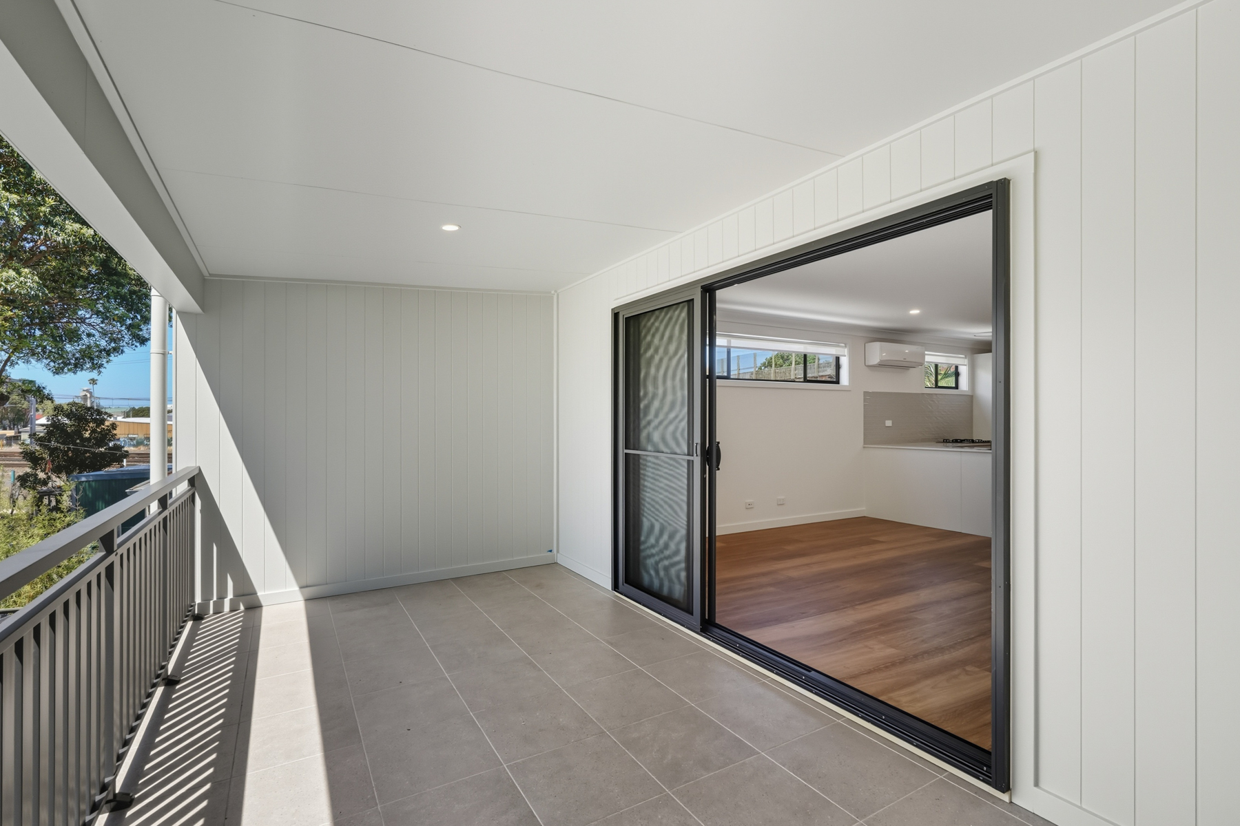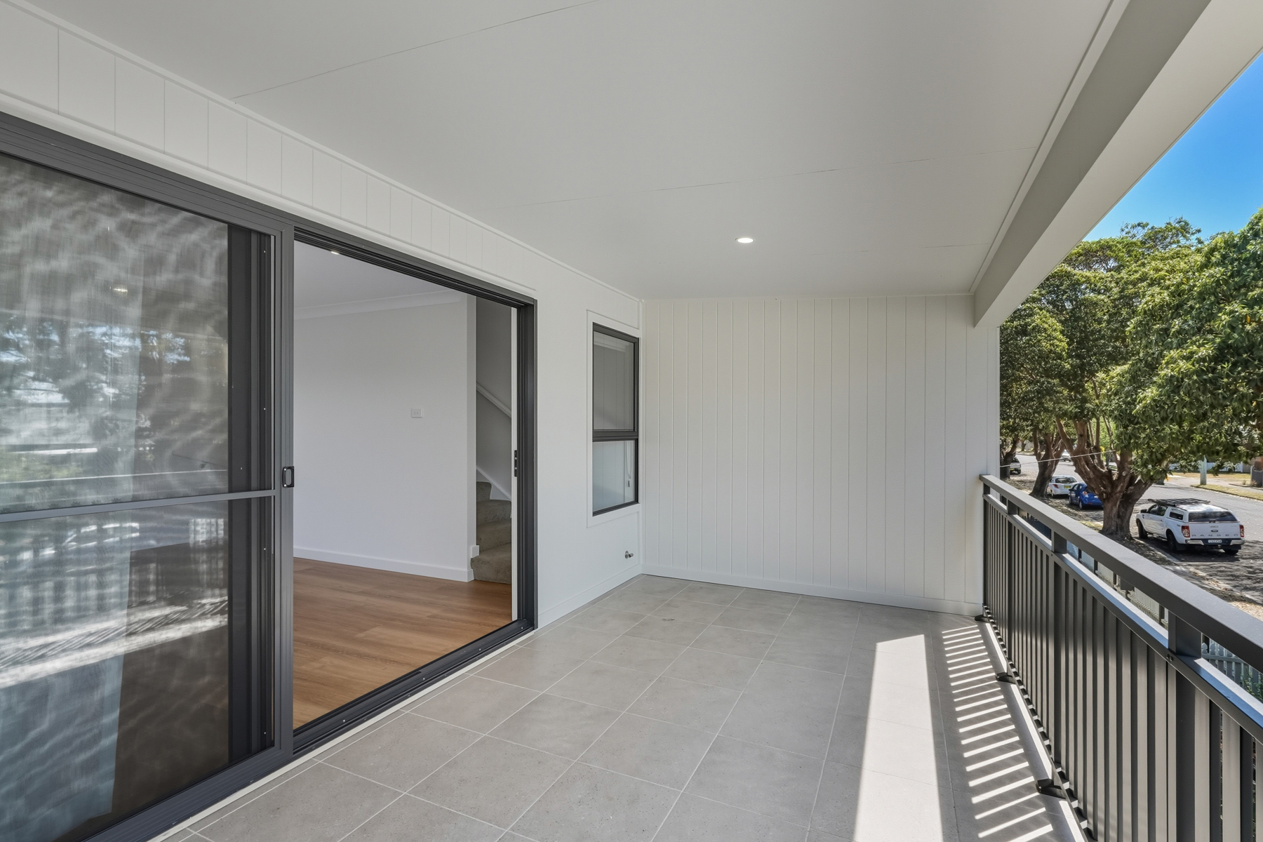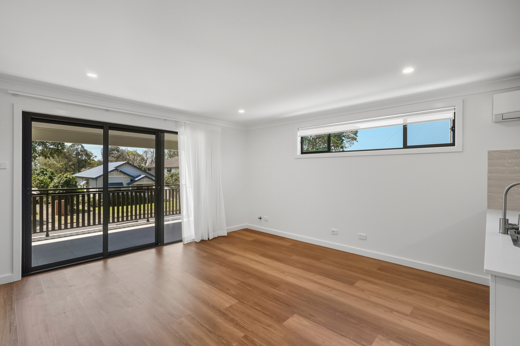 – On level one is the open-plan living area with a sliding doors onto a covered balcony at the front of the property with a gas BBQ outlet