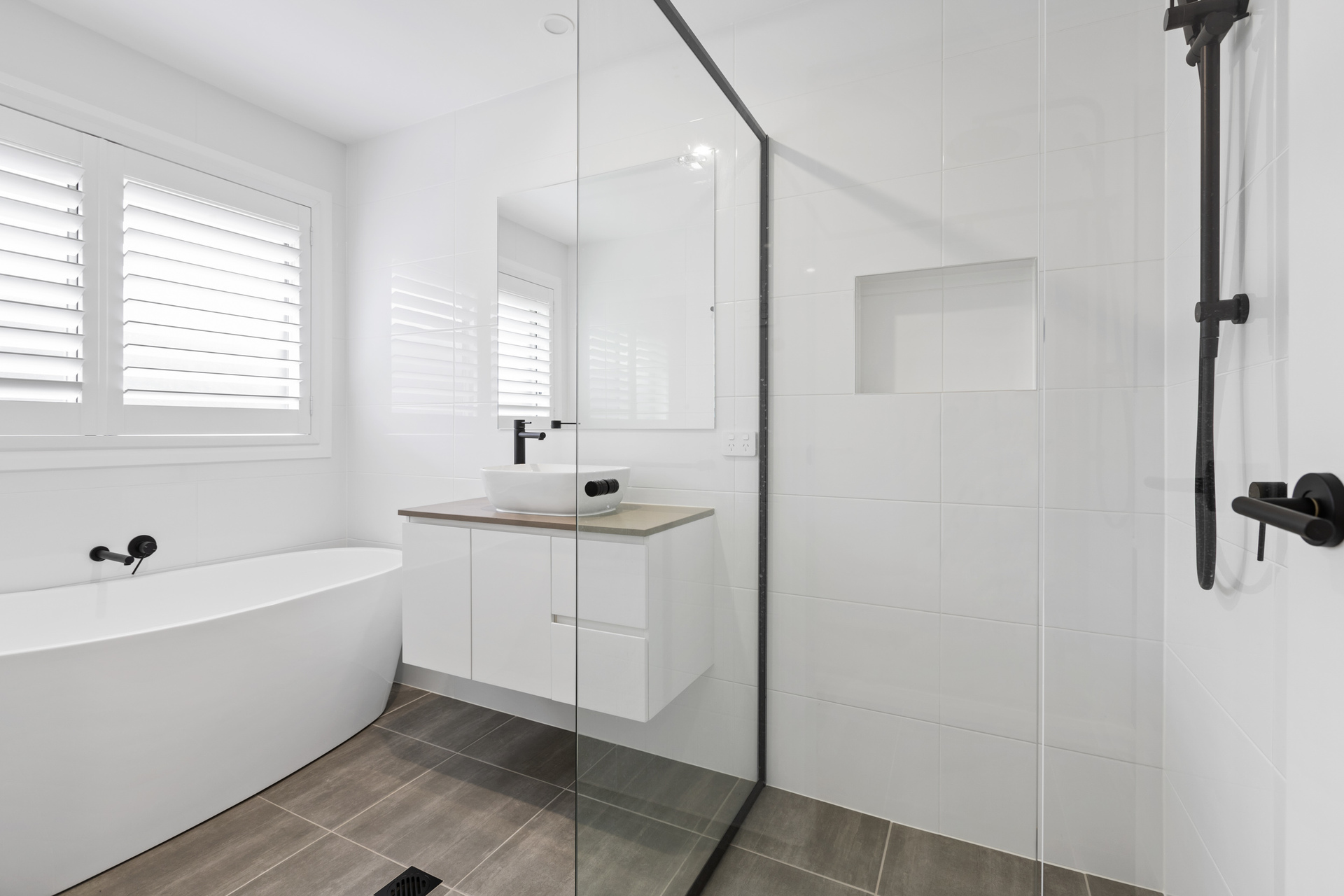 – Main bathroom with stand-alone bathtub, vanity and shower