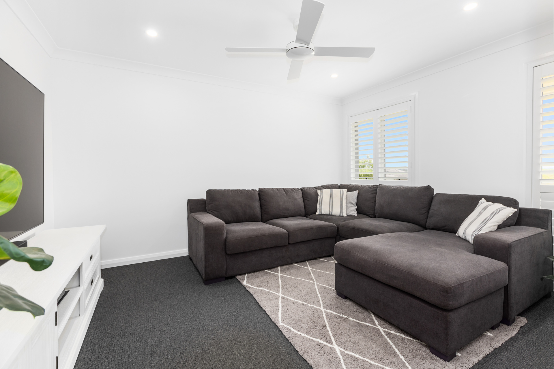 – Carpeted media room with ceiling fan
