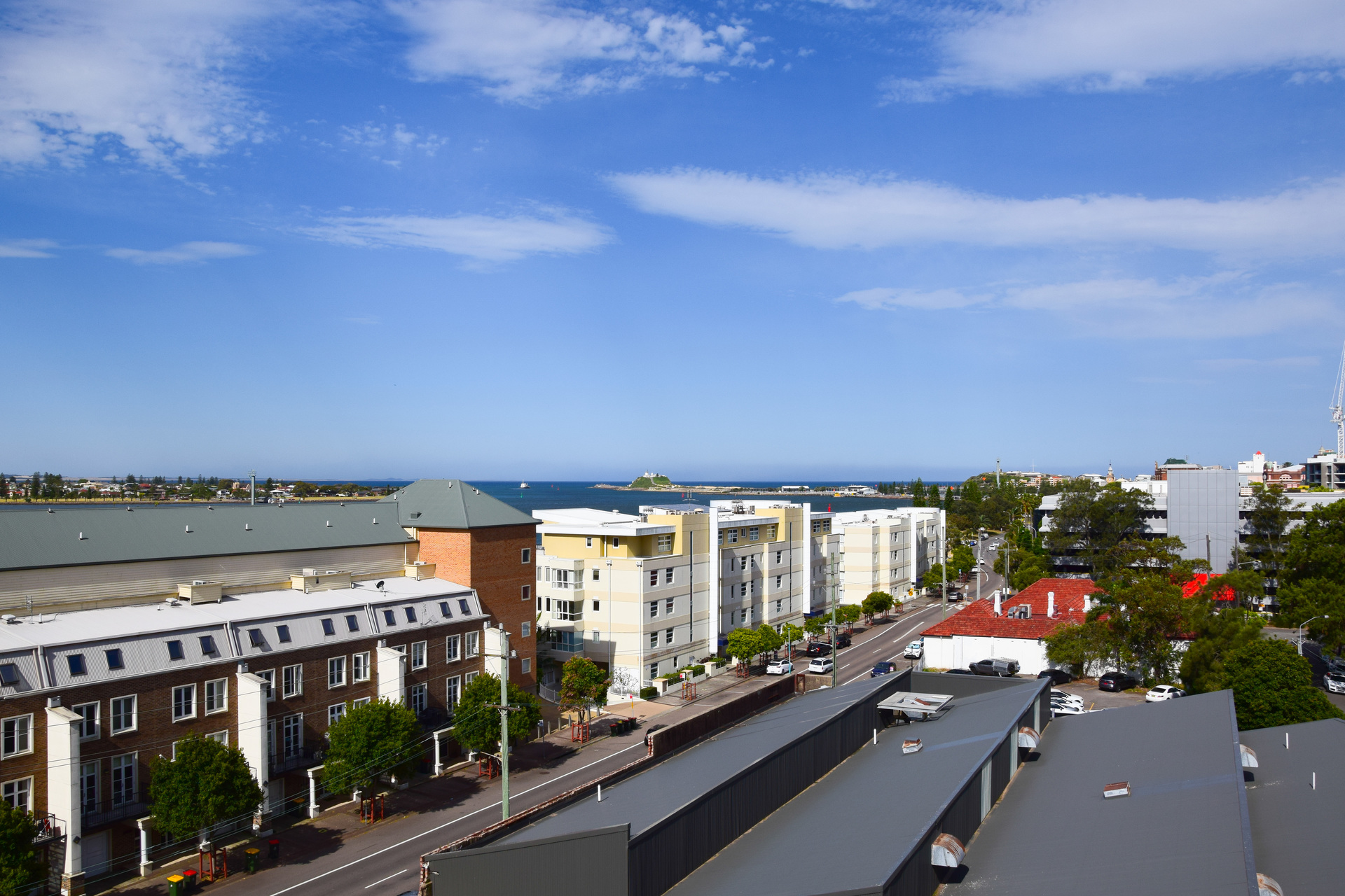 This thee-bedroom, two-bathroom apartment with panoramic views out to Nobby’s is centrally located within the Honeysuckle entertainment and dining precinct